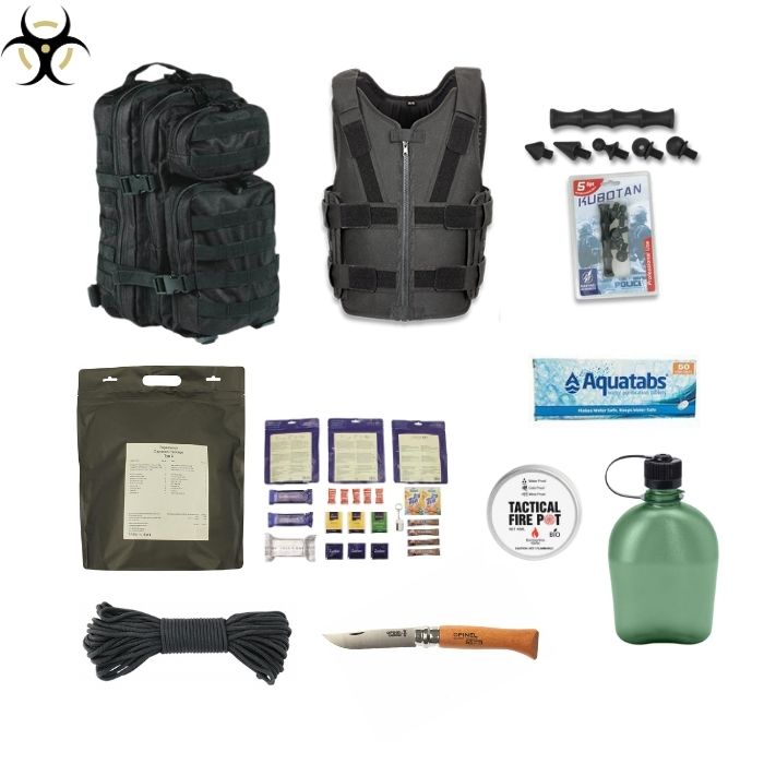 El kit supervivencia elemental incluye todo lo necesario para cubrir las necesidades bàsicas. Cubriendo defensa, seguridad, comida, agua y calor. Una mochila tactica de Inmortal warrior acompañado de un kubotan de defensa y un chaleco anti pinchazos y punzadas. de esta forma estaras más protegido ante cualquier intento de ataque por cualquier individuo que tenga un arma punzante.  Las pastillas potabilizadoras y la cantimplora te dan la oportunidad de poder tener 50 litros de agua potable en cualquier lugar. Si el agua es muy turbia, serian 25 litros de agua potable.
