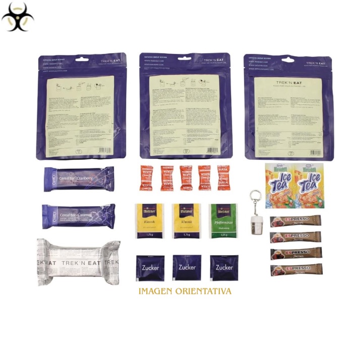 Cada pack ofrece más de 3000 kcal, una larga vida útil de hasta 5 años, y una variedad de alimentos pensados para mantener la energía durante largas jornadas en la naturaleza.