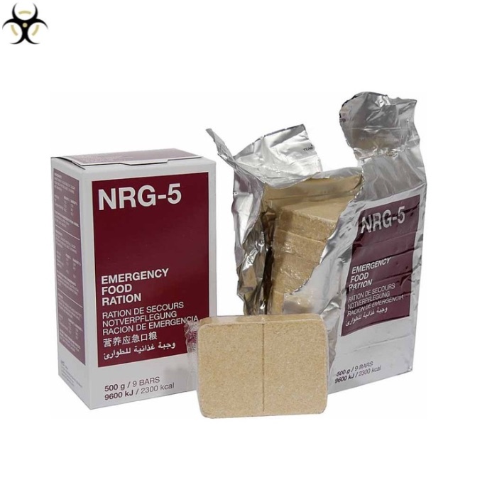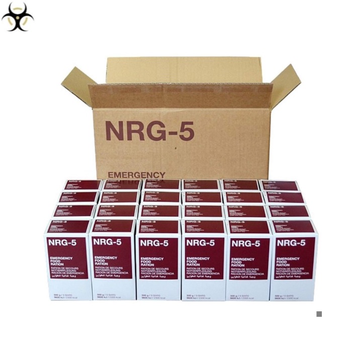 Las NRG-5 son raciones de emergencia compactas y altamente energéticas, diseñadas para garantizar una alimentación completa en situaciones críticas. Esta caja incluye 24 paquetes de 500 g, cada uno con 9 barritas listas para consumir.